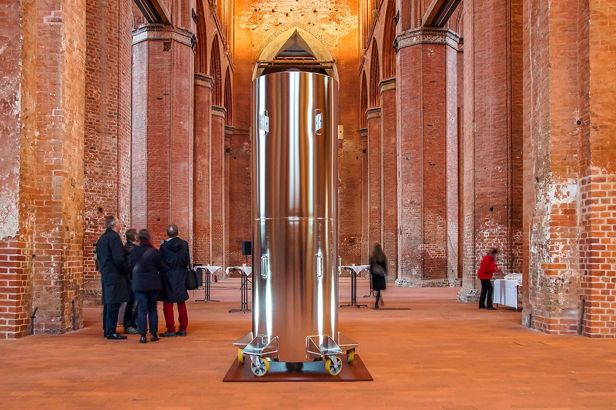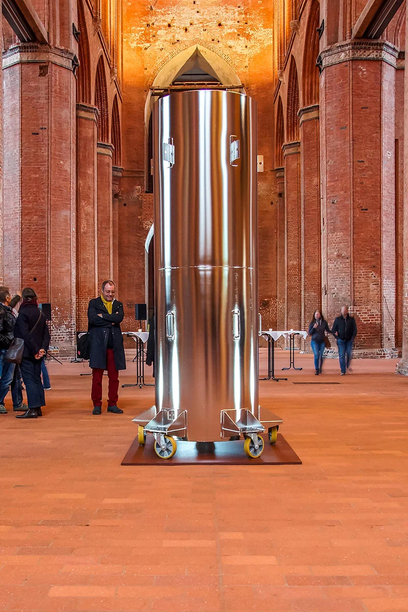 Gregor Schneider wurde eingeladen, im KUNSTRAUM St. Georgen eine seiner aktuellen Installationen in Korrespondenz mit der Architektur der St.-Georgen-Kirche zu präsentieren. Themenschwerpunkt seiner künstlerischen Arbeit ist die Auseinandersetzung mit dem Raum. Für die Präsentation im KUNSTRAUM St. Georgen in Wismar hat Gregor Schneider bewusst die Skulptur „CRYO-TANK PHOENIX 3“ gewählt und nimmt mit dieser Raum-im-Raum-Inszenierung Bezug auf das Thema des allgemein tabuisierten und schwierigen Umgangs mit dem Tod und dem toten Körper auf.