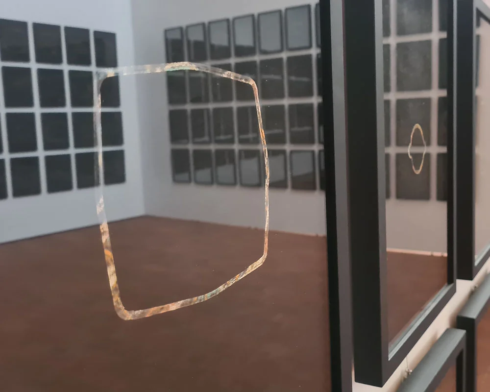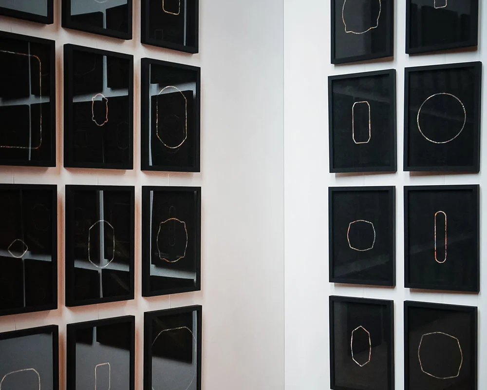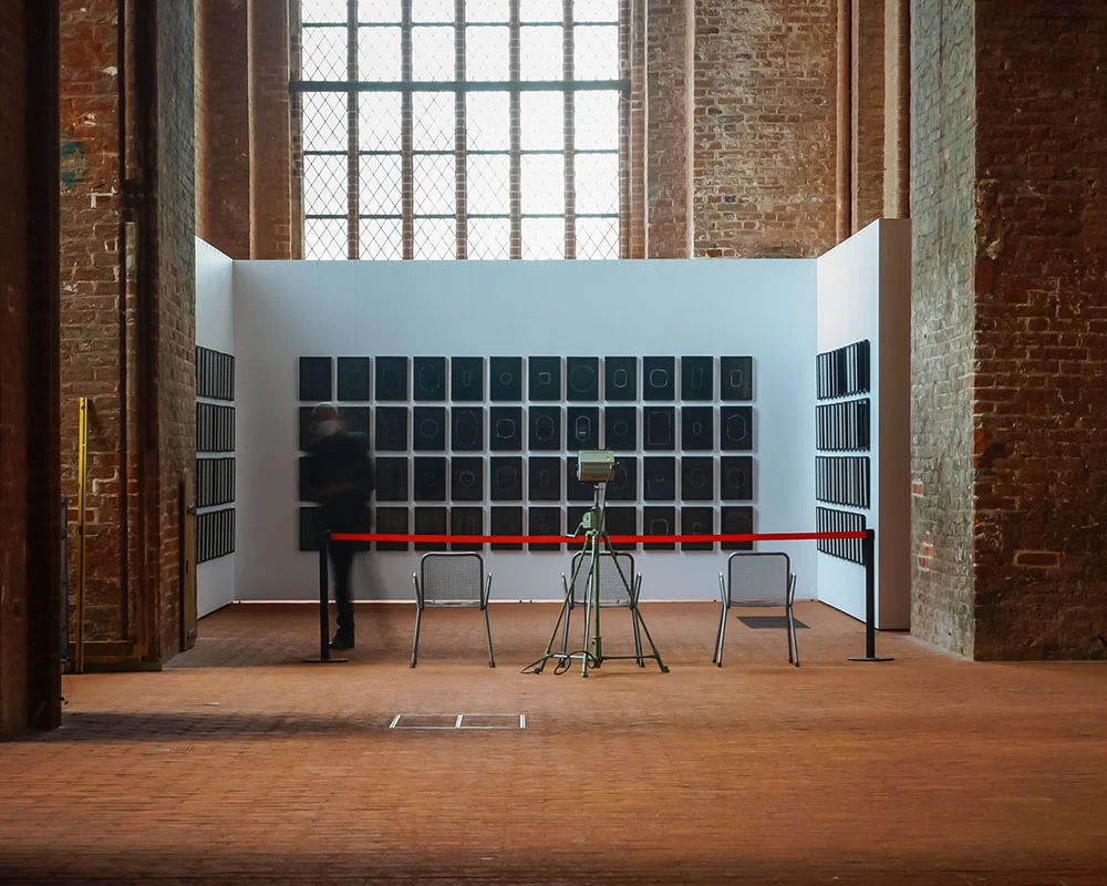 Ein Block aus Zeichnungen, bestehend aus 150 schwarzen Rahmen im Format A3, wird an einer solitär im Raum stehenden Stellwand präsentiert. Die Hängung ist in der Weise angelegt, dass die Details der Bildmotive im Nahbereich gut ablesbar sind.