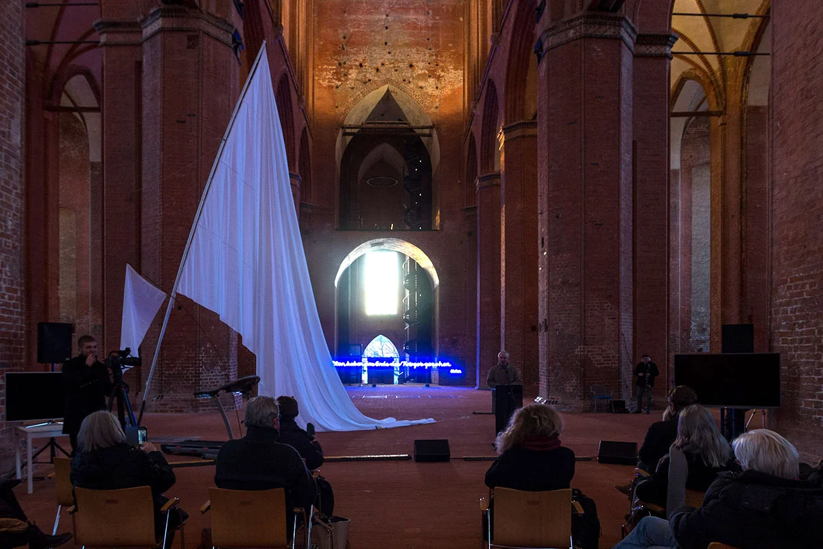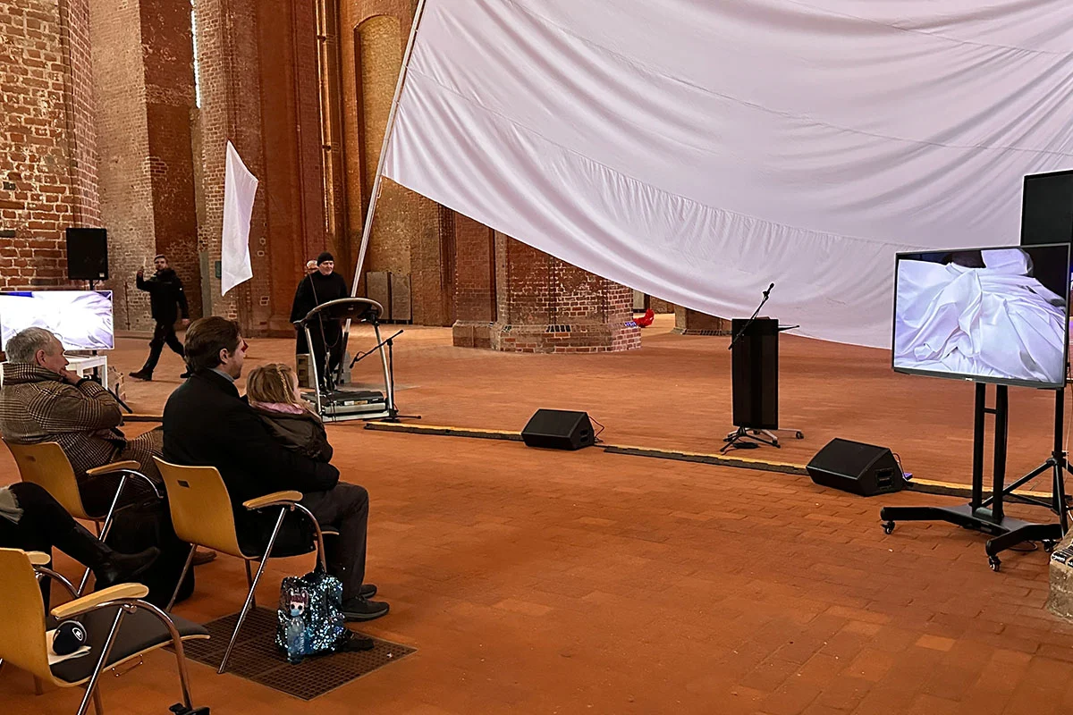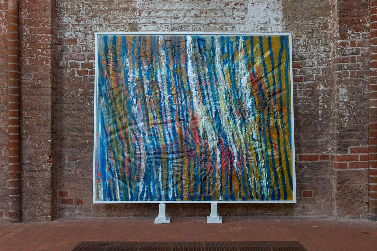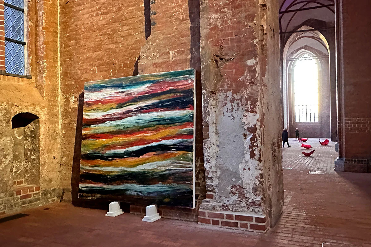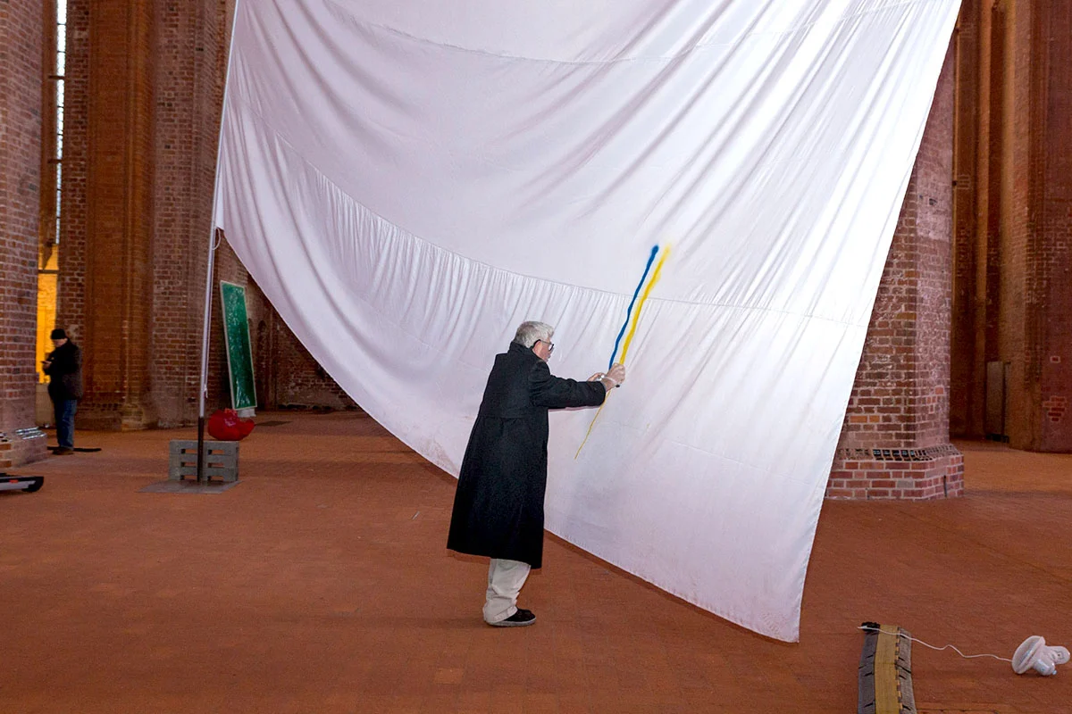 Eine weiße Fahne im Kirchenschiff mit blau-gelb gesprühten Linien fällt – die neue Ausstellung in der Wismarer Georgen-Kirche setzt Zeichen.