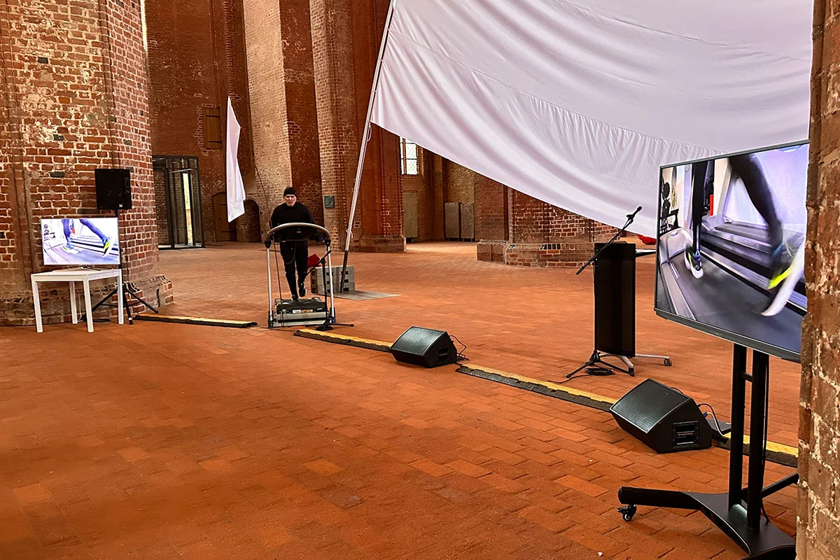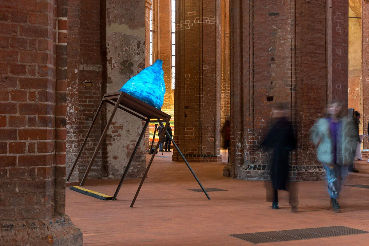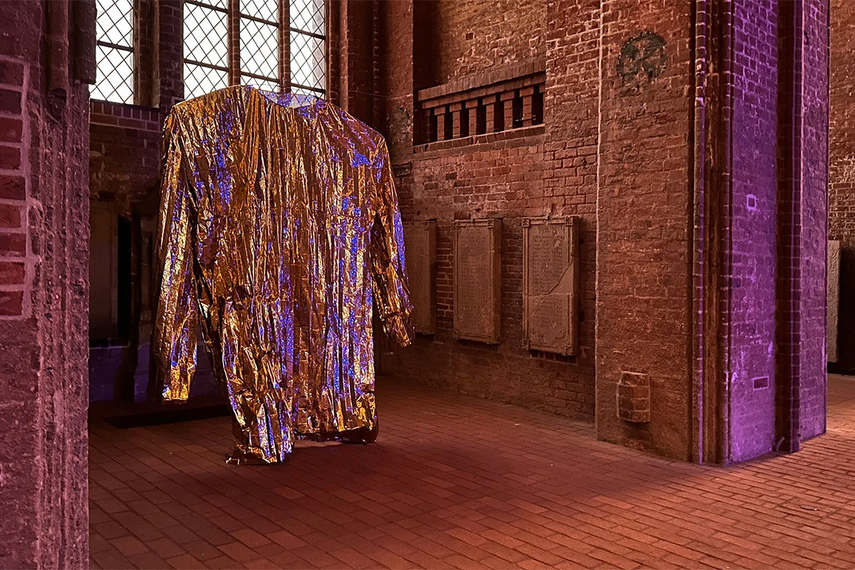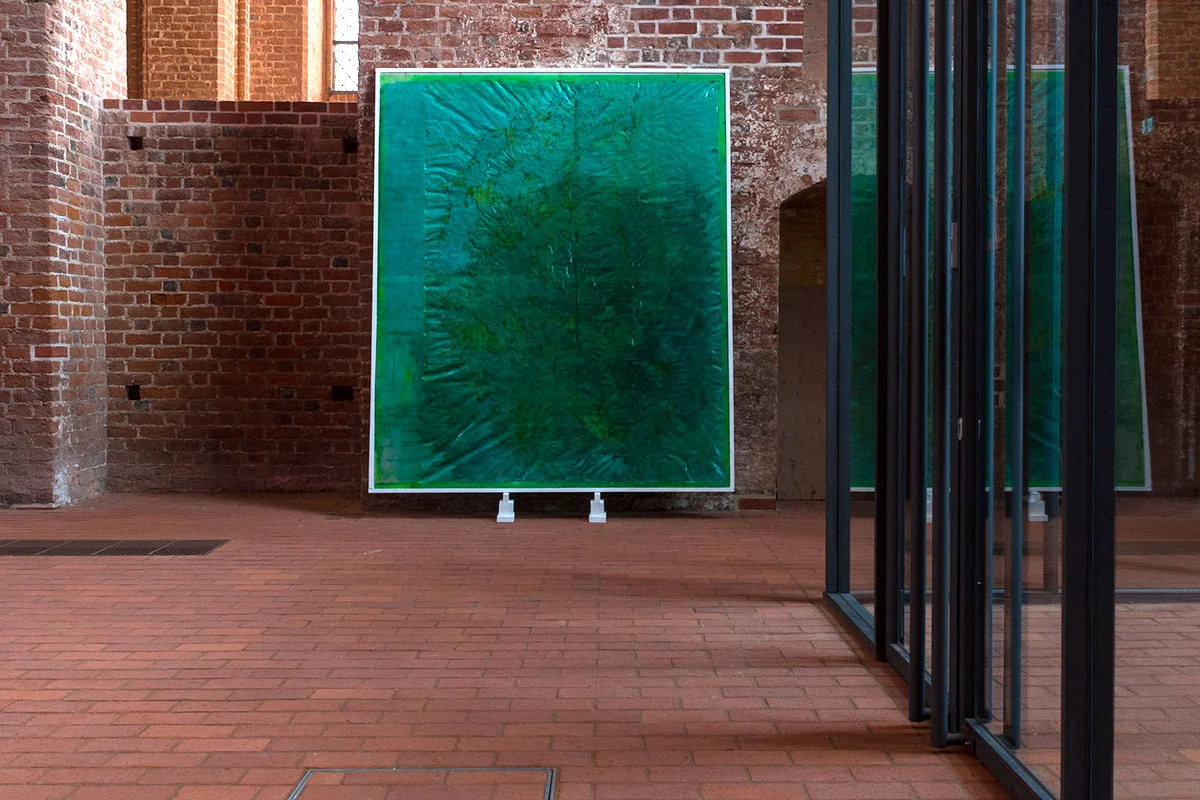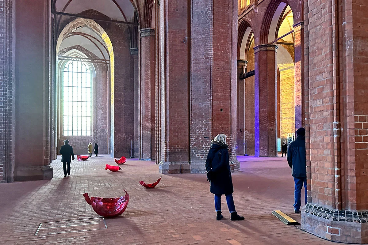 Eine weiße Fahne im Kirchenschiff mit blau-gelb gesprühten Linien fällt – die neue Ausstellung in der Wismarer Georgen-Kirche setzt Zeichen.